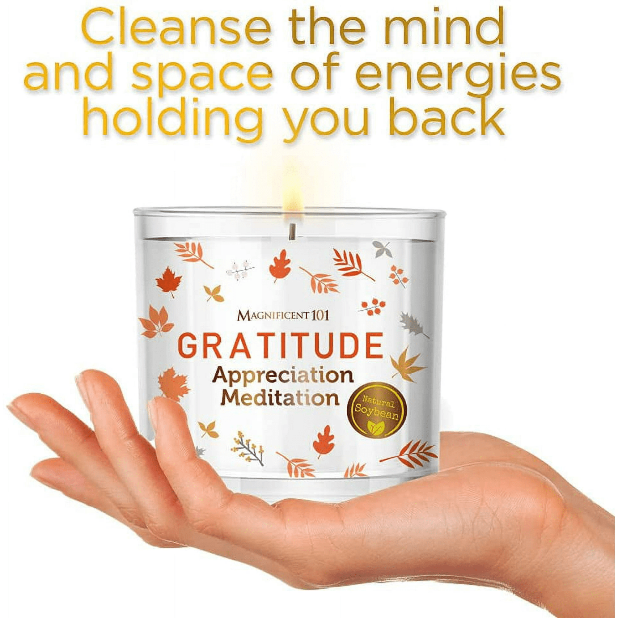 14 oz aromatherapy gratitude candle − made of natural soybean wax (sgs and msds report available - no petroleum or paraffin wax). Devoted to clearing and abundance blessings. This blend of abundance related rose, jasmin, lavender, lilac, sage herbs and essential oils is designed to create a natural abundance state in the home and body.